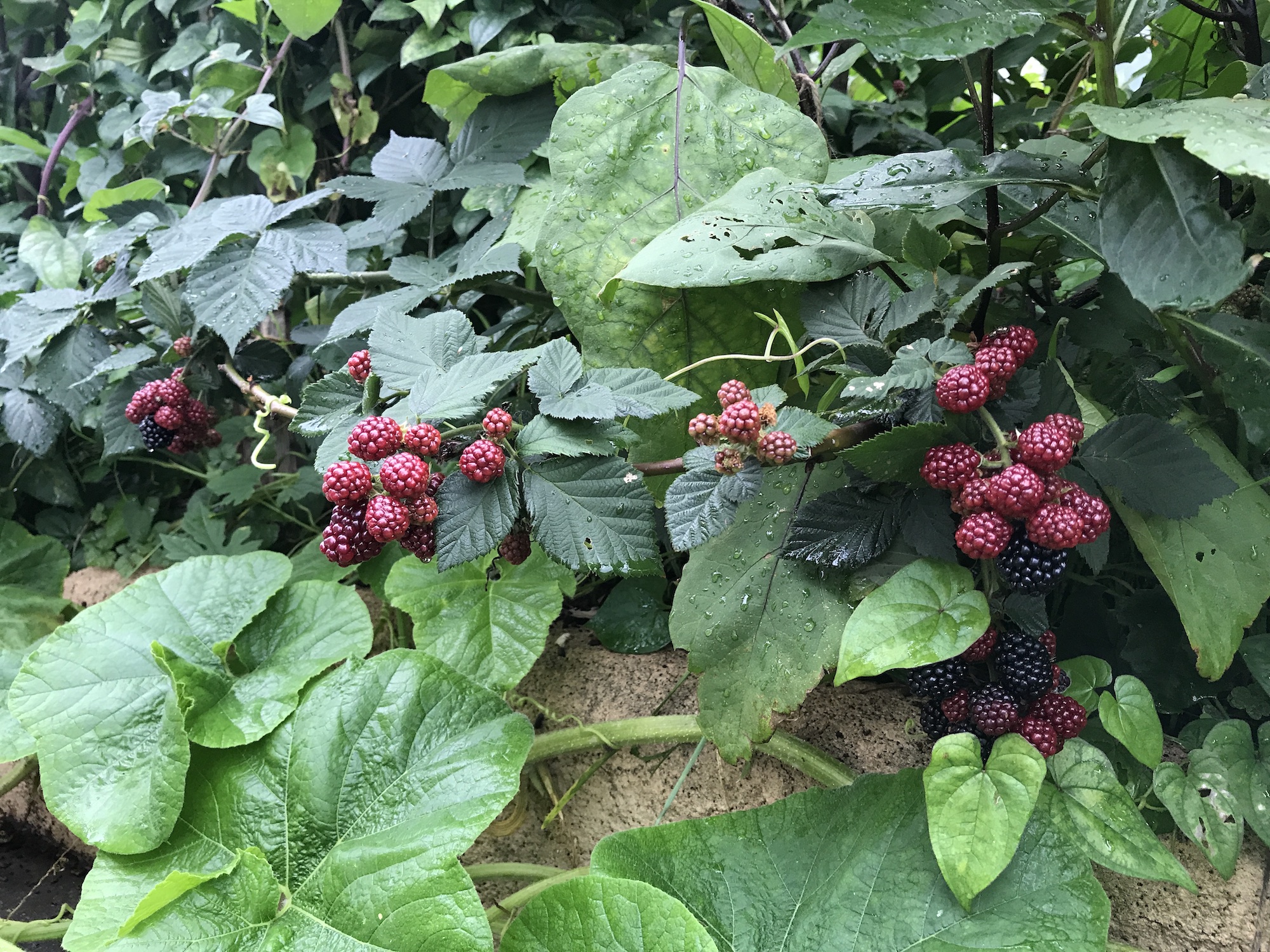 キイチゴ類は何種類か試したが、ほかのものは地下茎で勢力を拡大したり、木のように育って扱いにくかった。また、ブルーベリー類を植えるには日照が足りない場所でもブラックベリーはよく茂る。完熟した実は巨峰に似た芳香があっておいしい。