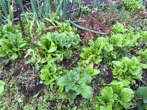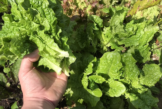 春先に初心者が葉物を植えるなら、サンチュがいい。結球するタイプのレタスは土が痩せているとうまく育たないこともあるが、サンチュやサニーレタスなどはどうやっても葉を茂らせる。育った葉を数枚かき取って利用すれば、2、3日あとには新しい葉が伸びている。1×1m程度のスペースをサンチュエリアにしておけば、トウ立ちするまで毎日サラダをボウルいっぱいに楽しめる。初めて植える葉物は断然サンチュがいい。